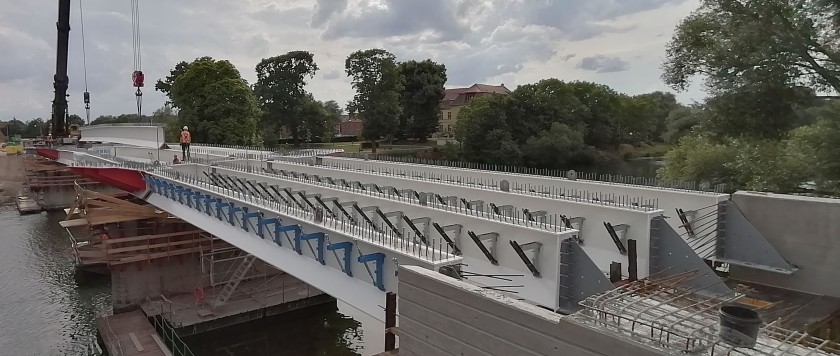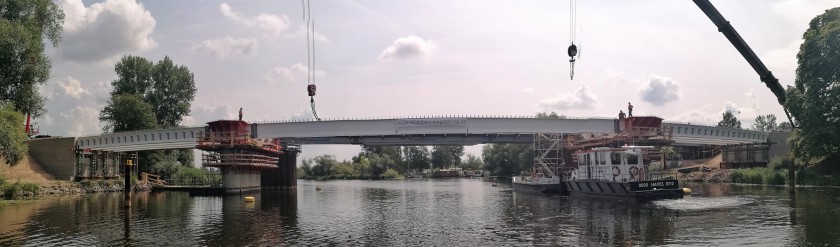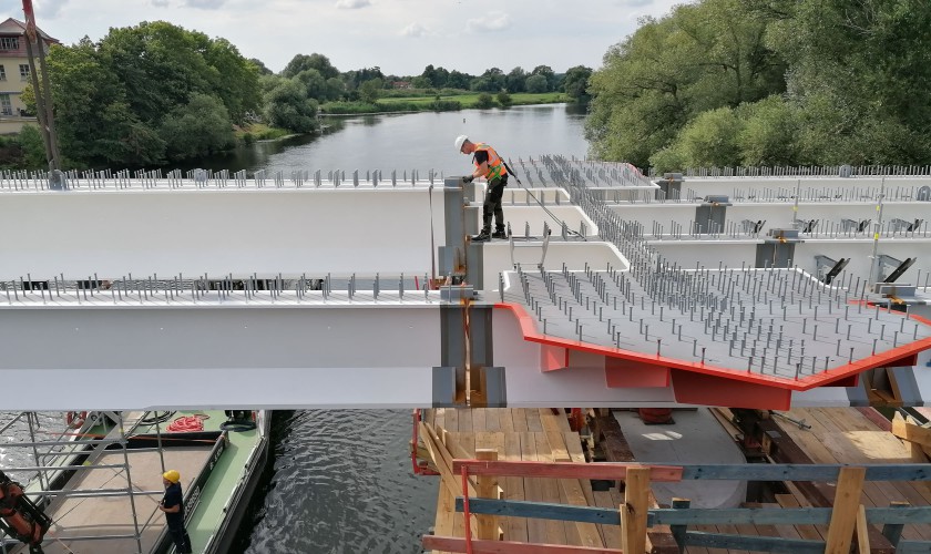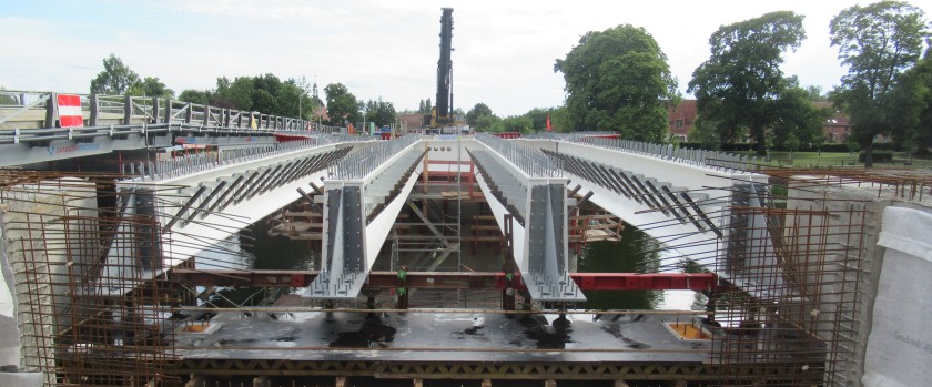 Das neue Brückenbauwerk wird als Balkenbrücke in Stahl-Verbund-Bauweise über 3 Felder hergestellt, gesamt ca. 285 to Stahlkonstruktion.