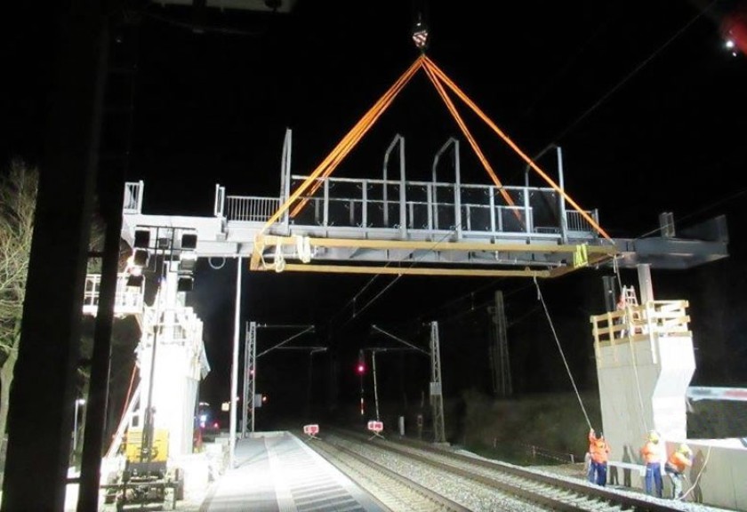 In einer Sperrpause der Deutschen Bahn wird die Fußgängerüberführung eingehoben-