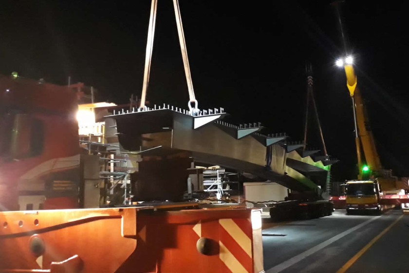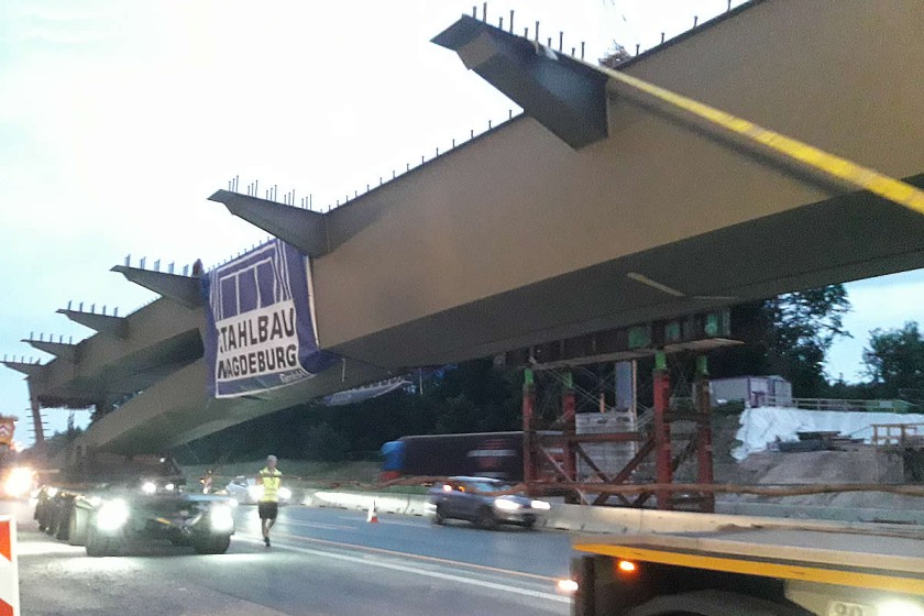 Die Schüsse werden dann auf die Baustelle geliefert und auf die Montagefläche / Traggerüste (Achse 10) eingehoben. Dort wird der Stahlüberbau komplettiert und deckbeschichtet.