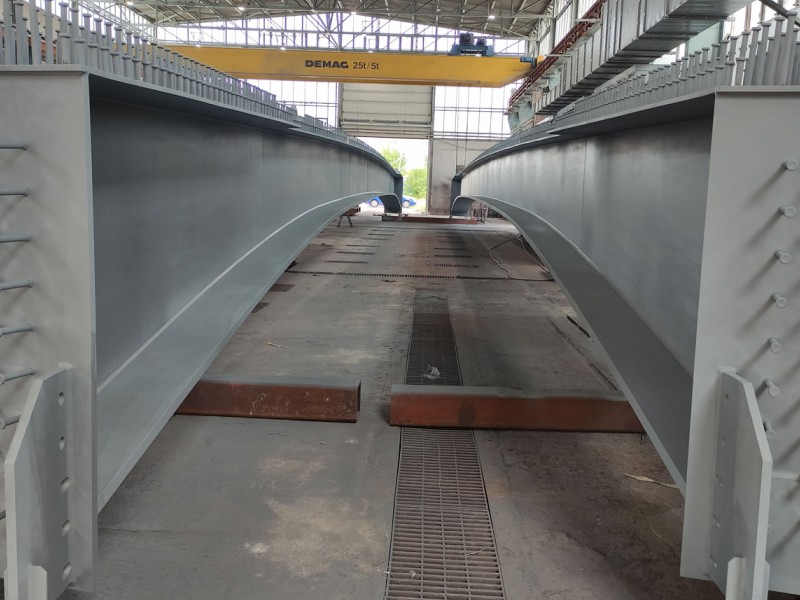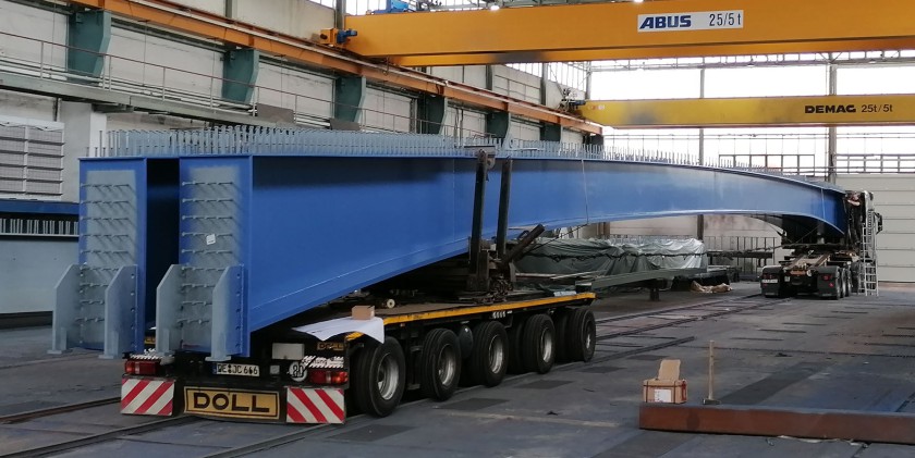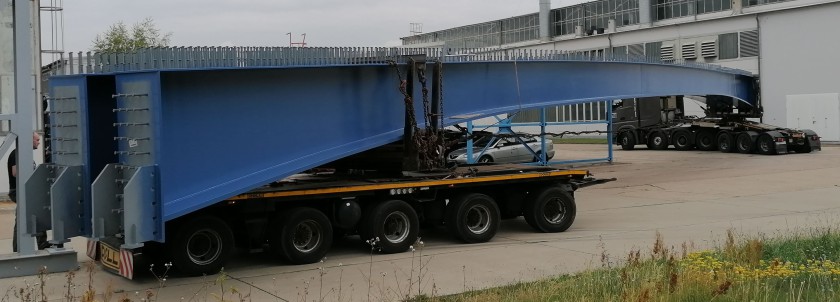 VFT-Träger in 38 m Länge zur Auslieferung ins Betonwerk, 2 Träger mit je 28 to Einzelgewicht.