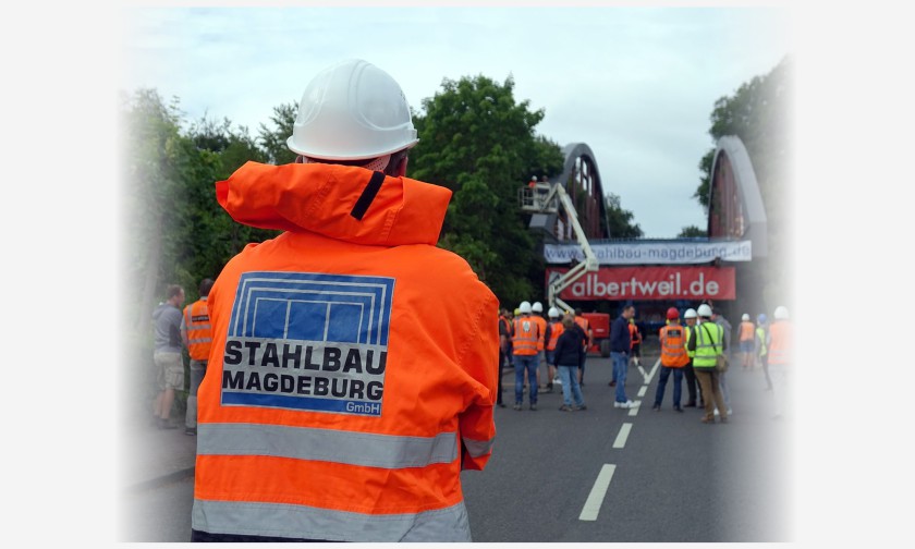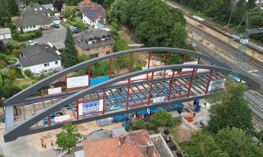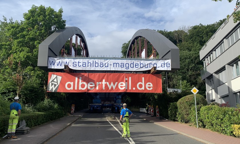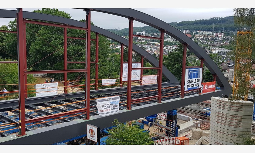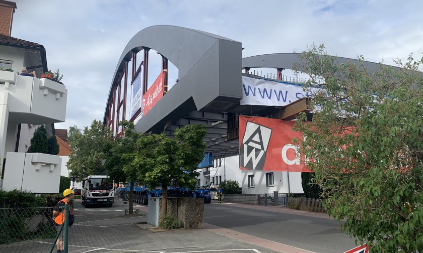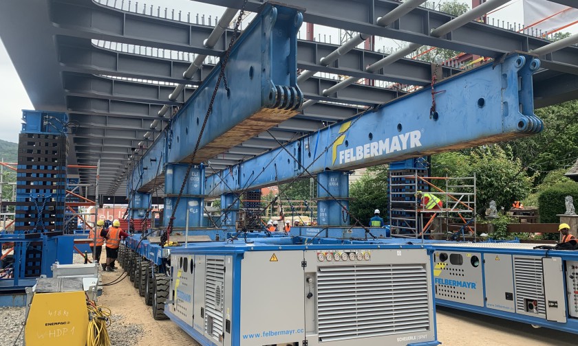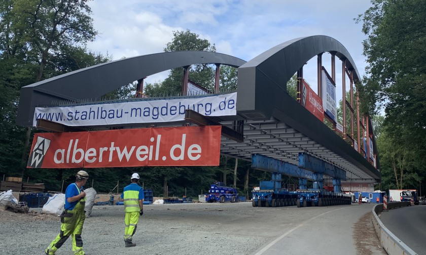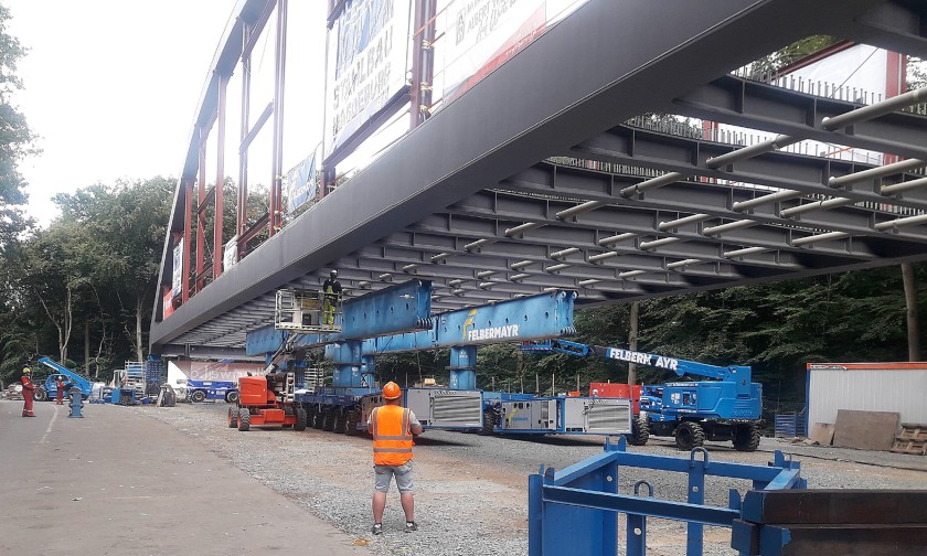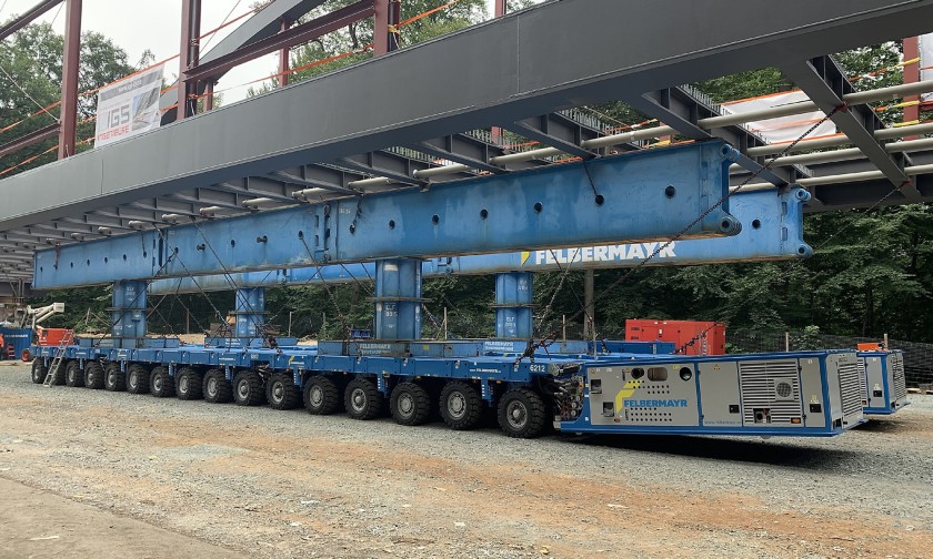 Der ca. 520 to schwere Überbau wurde auf der Vormontagefläche für den Transport mit SPMT zusammengebaut und zum Einschub-Ort transportiert. Hier erfolgt am kommenden Wochenende der Einschub der Brücke.
