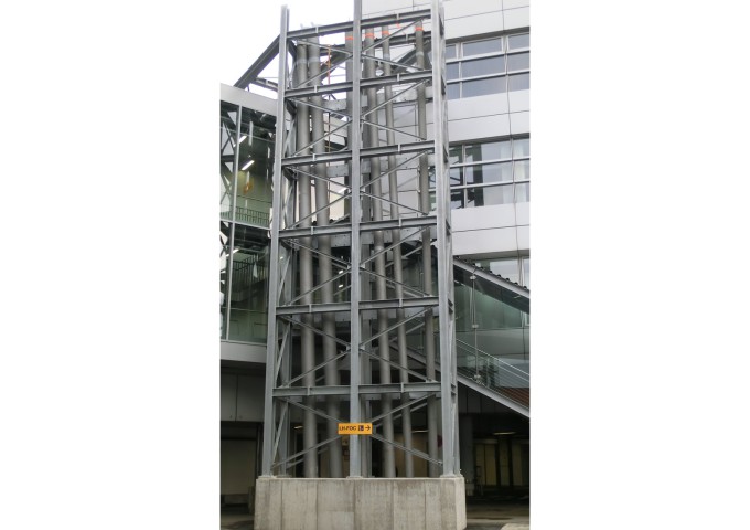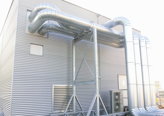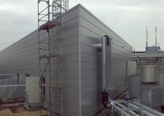 Auf dem Dach der Abfertigungshalle des Flughafen Düsseldorf wurden die Gebäude für ein Blockheizkraftwerk sowie einer Absorptionskälteanlage errichtet.