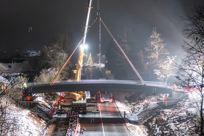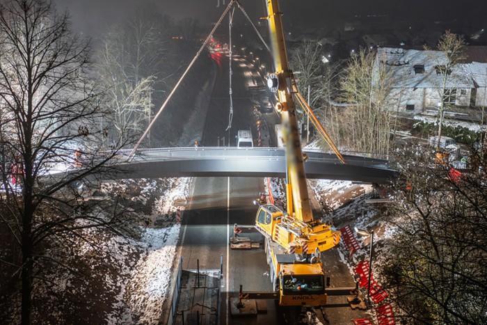 Der werkseitig hergestellte Stahlüberbau wird in einem Stück an die Baustelle angeliefert und dort mittels Mobilkran eingehoben.