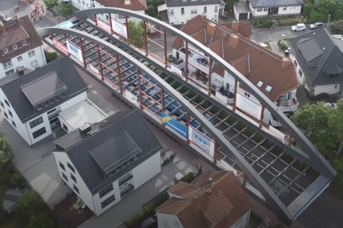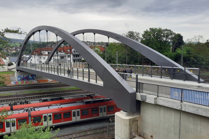 Den Überbau bilden zwei außen liegende, parallel angeordnete Stabbögen mit vertikalen Hängern.