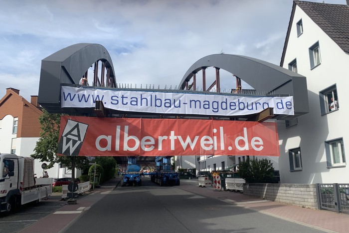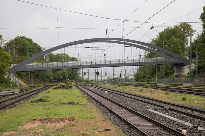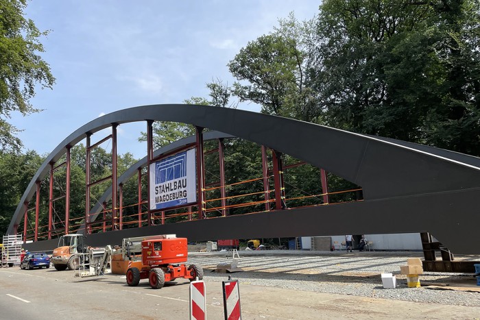 Die Bögen und Versteifungsträger werden als luftdicht verschweißte Stahlhohlkästen ausgebildet, die Hänger aus Vollstahl mit Kreisquerschnitt. In Querrichtung sind im Abstand von 2,10/2,40 m Stahlträger angeordnet, die gemeinsam mit dem Aufbeton als Verbundquerschnitt wirken. Die Regelquerträger werden als offene Schweißprofile, die Endquerträger als luftdicht verschweißte Stahlhohlkästen ausgebildet.