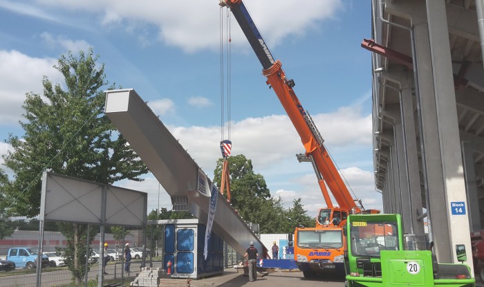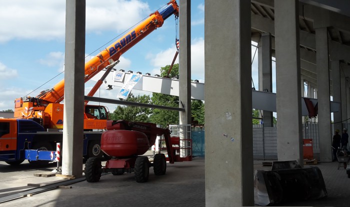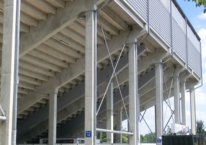 Das Stadion wird wegen Statikproblemen teilweise ertüchtigt: zuerst die Tribünen des Gästebereiches.