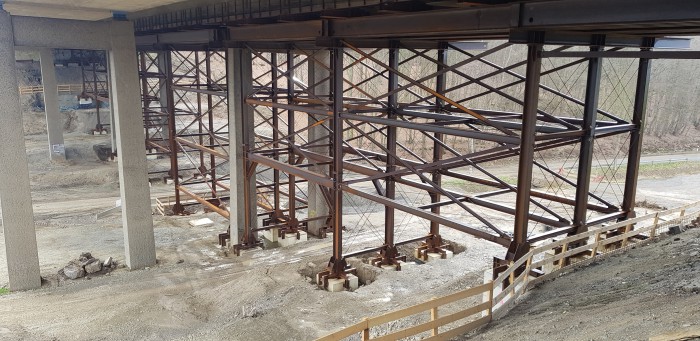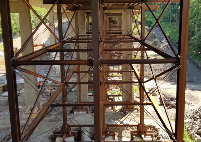 Beim Sicherungsgerüst handelt es sich weitestgehend um eine Stahlkonstruktion aus Profilstahl-Stäben, die auf den Rammpfählen der Bestands-Brücke und neuen Bohrpfählen tief gegründet wird.