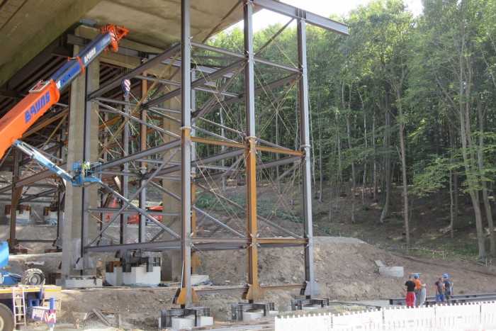 Hierzu wird das südliche Bestandsbauwerk vorab mit einem Sicherungsgerüst versehen, da nicht ausgeschlossen werden kann, dass der vorhandene südliche Überbau durch den 4+0-Verkehr während der Bau-phase zur Herstellung des nördlichen Überbaues Schädigungen erfährt und örtliche Versagenszustände auftreten.