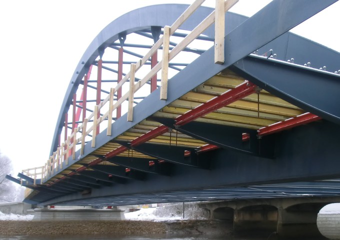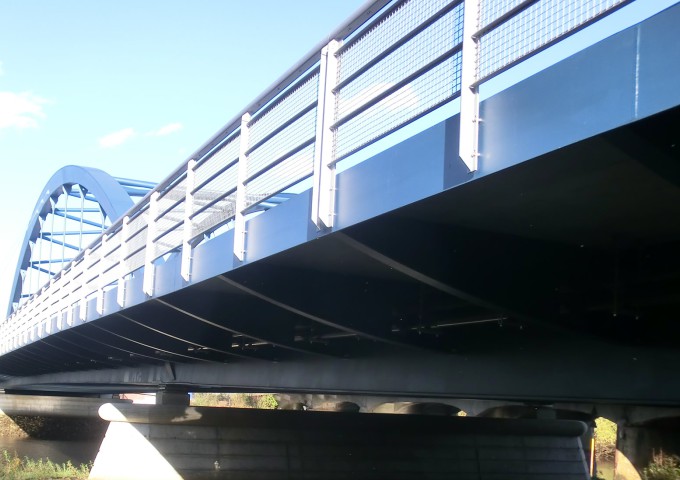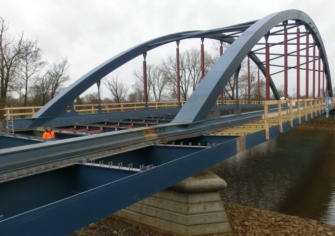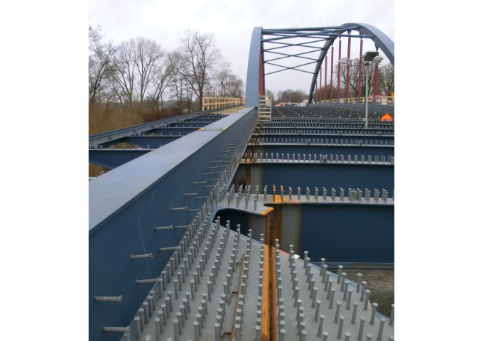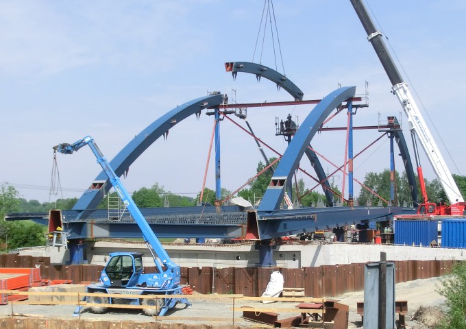 Die neue 3-Feld-Brücke wurde mit einer stählernen Bogenkonstruktion als Flussbrücke und beidseitigen anschließenden Vorlandbrücken in Stahlbetonverbundbauweise gebaut. Auf der Brücke stehen beidseitig gemeinsam zu nutzende ausreichend breite Nebenanlagen für den Geh- und Radwegverkehr zur Verfügung. In der Mitte der Brücke laden kleine Kanzeln zum Verweilen ein.
